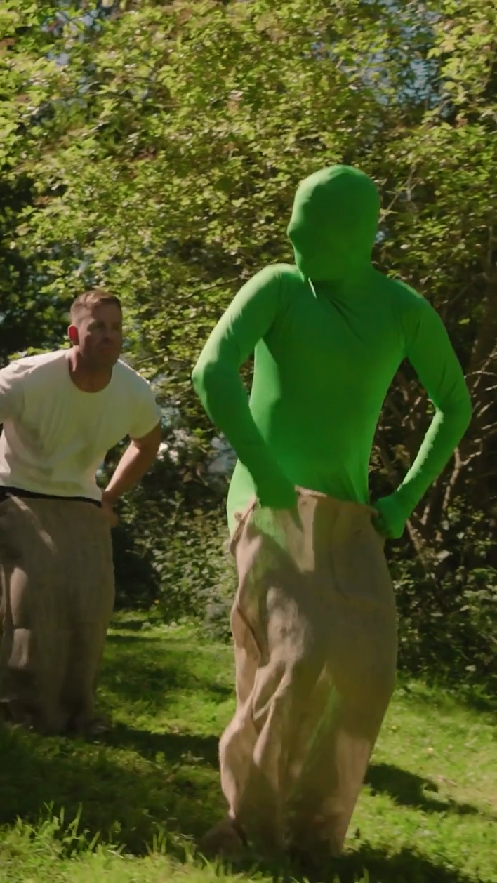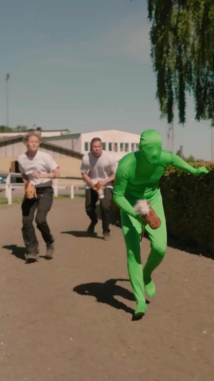 Opgave: Lav filmindhold til SoMe, der fanger opmærksomheden hos VVS’ere og elektrikere og minder dem om muligheden for – og vigtigheden af – at tage grønne AMU-kurser. Løsning: Personificering af den grønne omstilling som en grøn person, der jagtes af håndværkerne. I løb, i sæk og til “hest”.